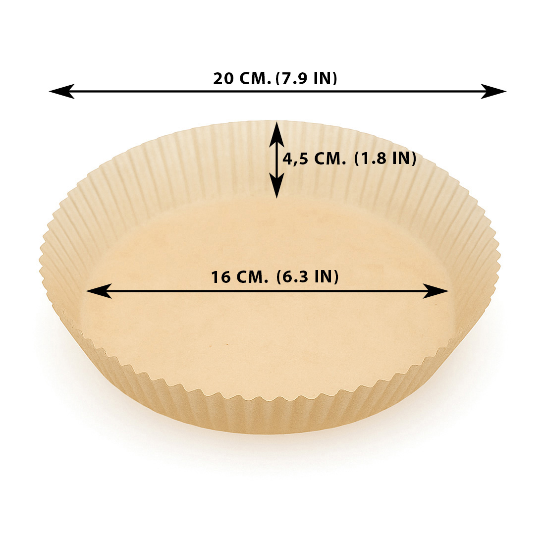 100 pad in carta da forno rotondi 20 x 16 x 4,5 cm (7,9 x 6,3 x 1,8 in) sono accessori pratici e versatili, ideali per friggitrice ad aria, forno e microonde. Realizzati in carta alimentare di alta qualità, sono resistenti al calore fino a circa 280° e ti permettono di cucinare in modo sano, leggero e senza grassi in eccesso.