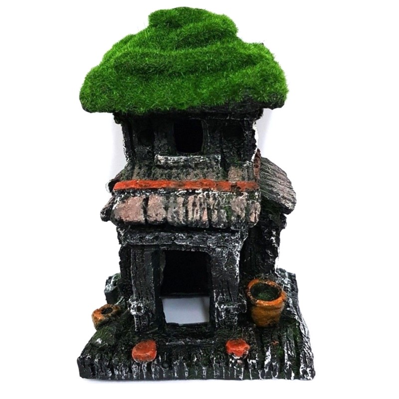 Simpaticissimo ornamento per decorare il vostro acquario in modo originale piccola casa a due piani ricoperta di finto muschio