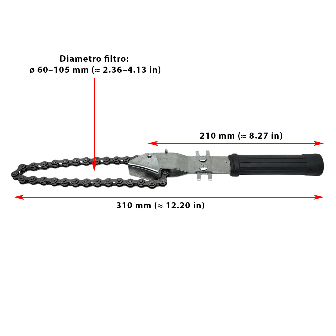 Con una lunghezza della barra di 210 mm e una lunghezza totale con catena di 310 mm, questa chiave consente di raggiungere filtri posizionati in spazi ristretti senza danneggiare il filtro o il motore.
