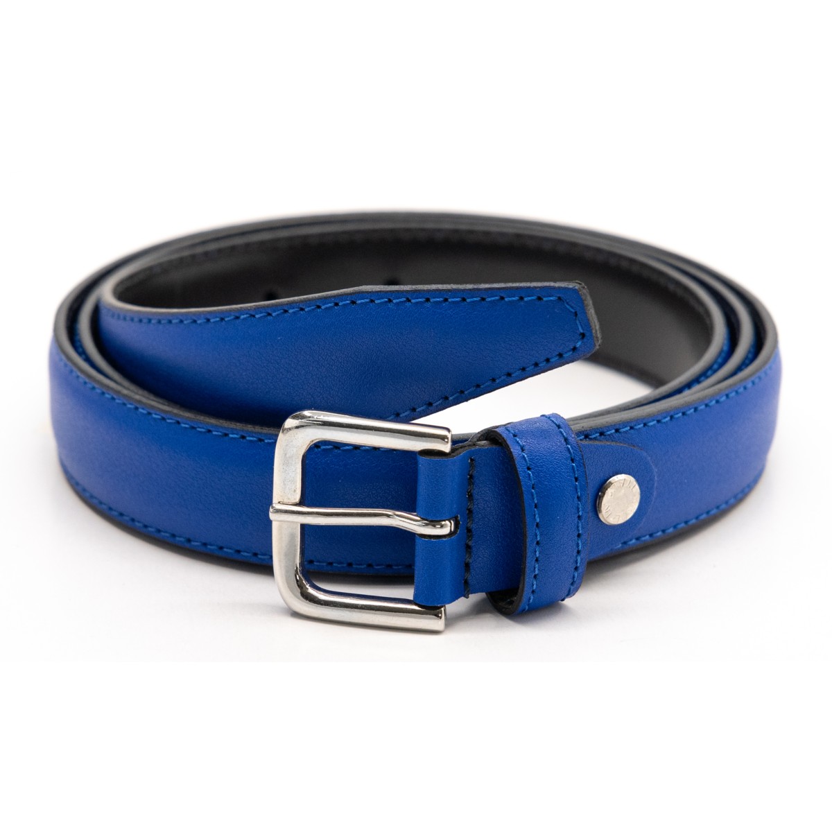 Cintura di colore blu elettrico altezza fusto 2,4 cm con fibbia lucida nickel free 3,5 x 3 cm, cucita con filo a colore e tagli tinti con le migliori procedure per realizzare un bordo uniforme e bombato.