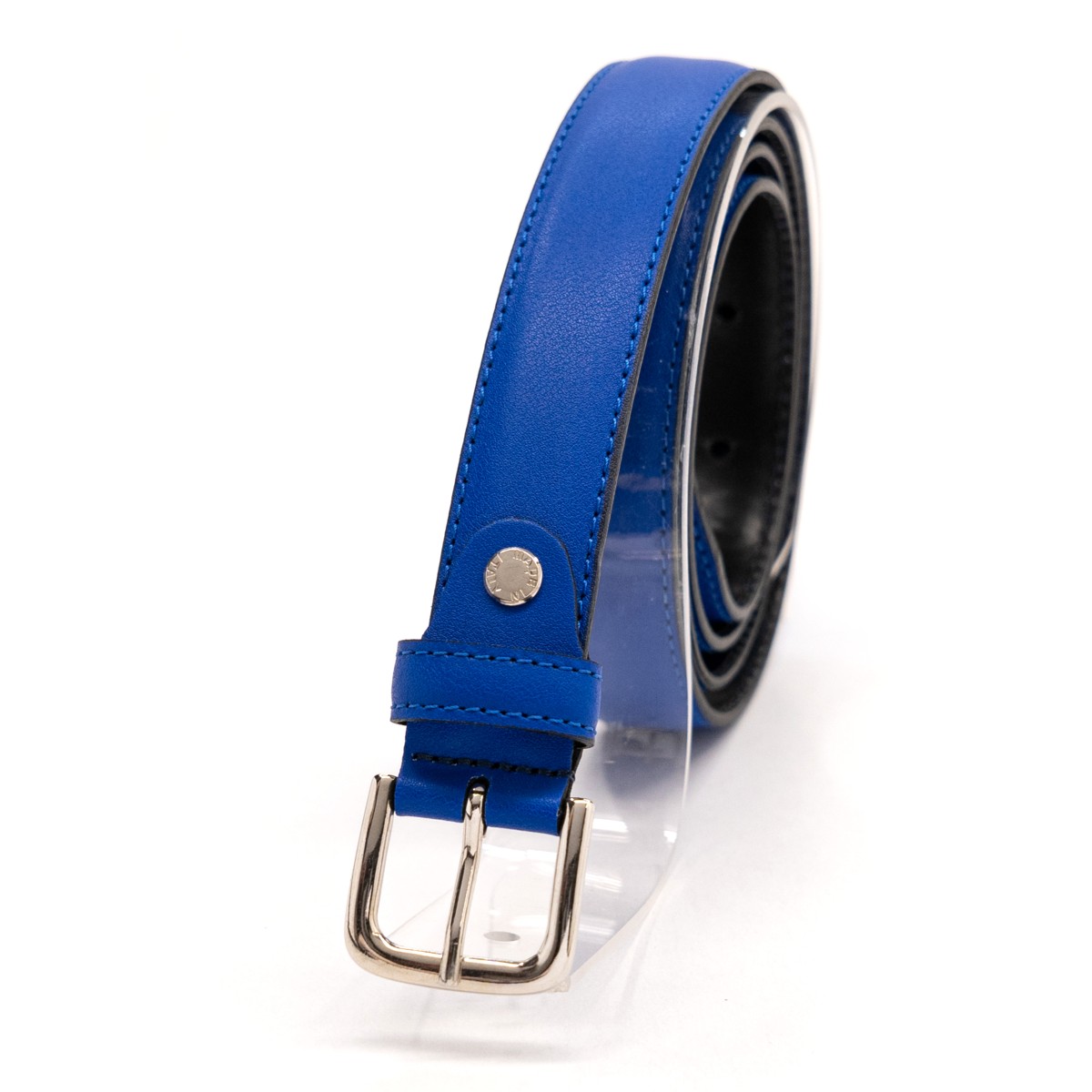 Cintura di colore blu elettrico altezza fusto 2,4 cm con fibbia lucida nickel free 3,5 x 3 cm, cucita con filo a colore e tagli tinti con le migliori procedure per realizzare un bordo uniforme e bombato.
