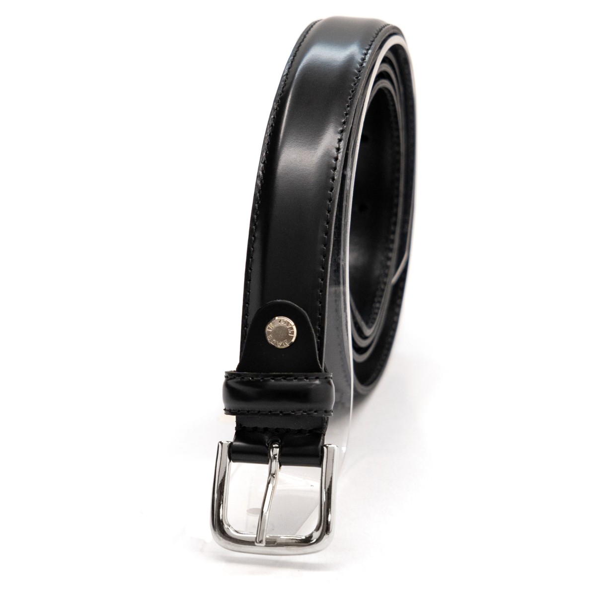 Cintura di colore nera con fibbia lucida nickel free 3,5 x 3 cm, cucita con filo a colore e tagli tinti con le migliori procedure per realizzare un bordo uniforme e bombato.