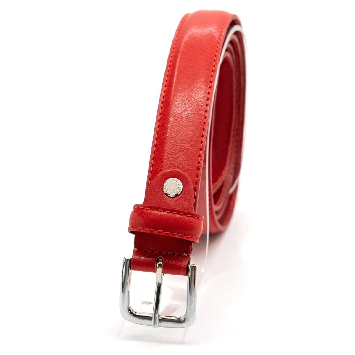 Cintura di colore rossa altezza fusto 2,4 cm con fibbia lucida nickel free 3,5 x 3 cm, cucita con filo a colore e tagli tinti con le migliori procedure per realizzare un bordo uniforme e bombato.