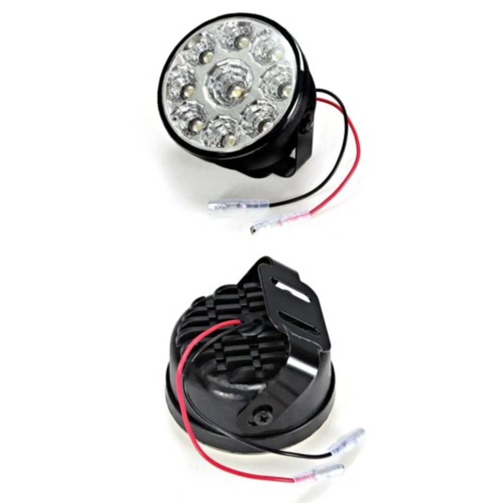 Coppia faretti fendinebbia Colore : Nero 9 LED Tensione : 12V Potenza : 9W Luce : Bianco Freddo Diametro : ø 7cm Profondità : 4cm Staffa regolabile Alta luminosità Basso consumo Lunga durata Impermeabili Cavi di connessione positivo e negativo
