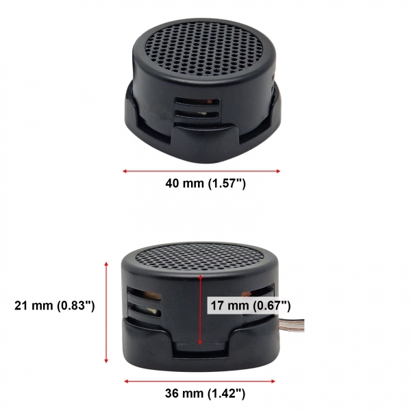 I tweeter, di forma rotonda, misurano 36 mm di diametro per 17 mm di altezza senza supporto e raggiungono un’altezza totale di 21 mm con il supporto montato, mentre la diagonale del supporto arriva a 40 mm.
