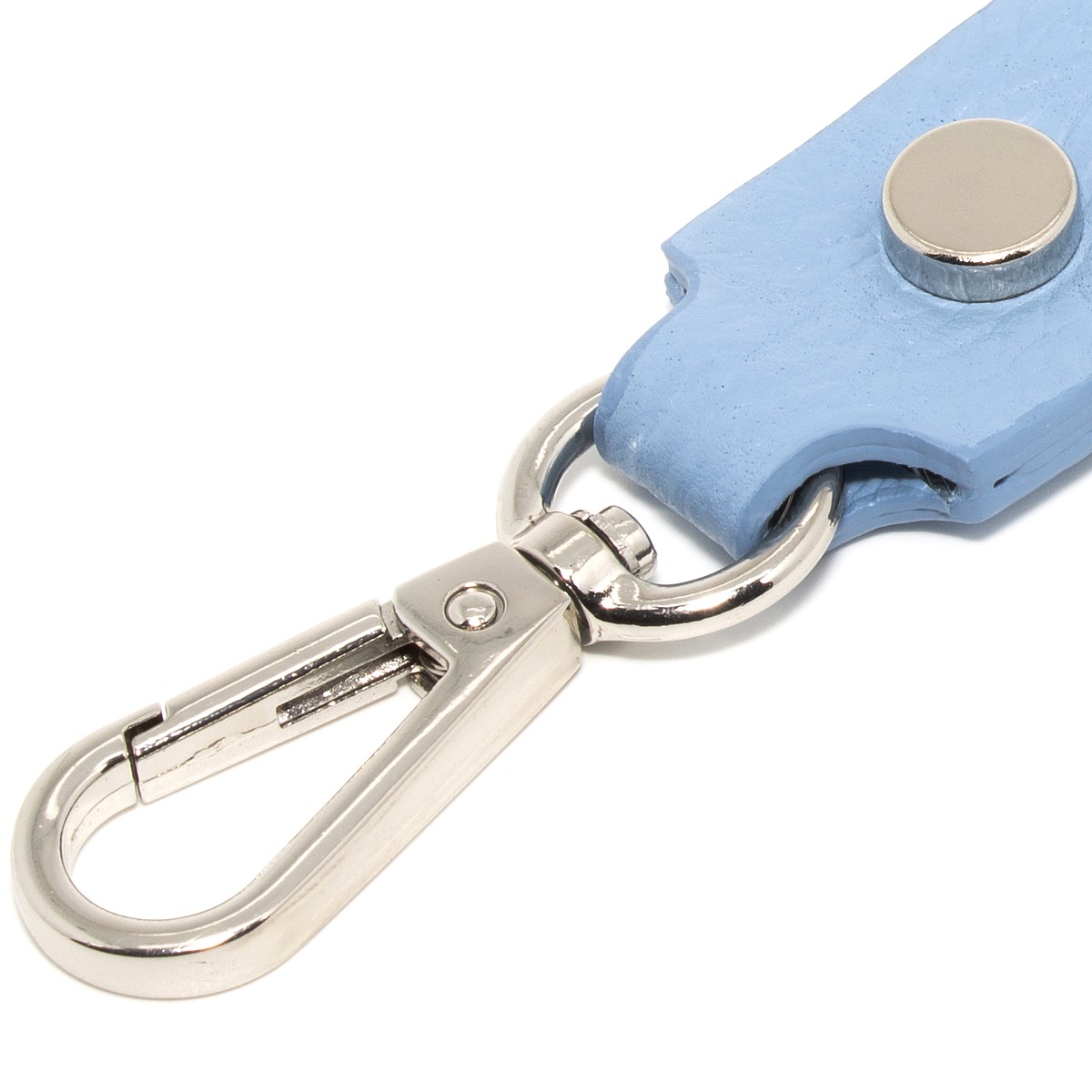 Portachiavi unisex colore celeste con moschettone e 2 anelli blisè da 30mm dando la possibilità di avere un portachiavi multiuso, infatti grazie ai 2 anelli in dotazione oltre ad avere la possibilità di inserire più chiavi, possiamo anche inserire pendoli, gadget e tanto altro.