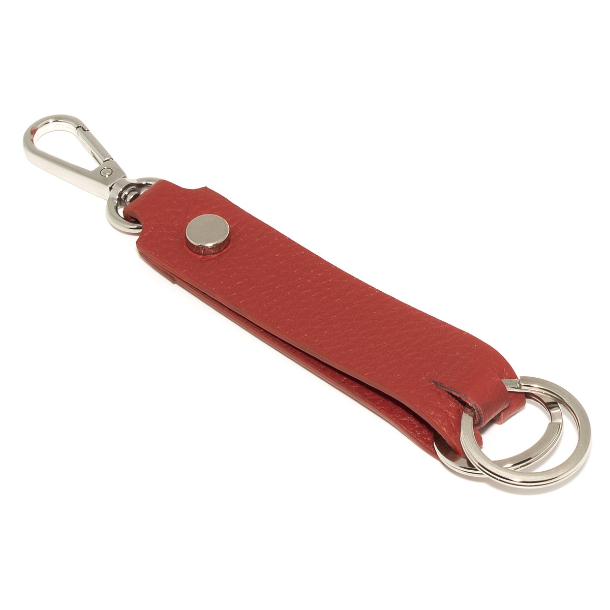 Portachiavi unisex colore rosso con moschettone e 2 anelli blisè da 30mm dando la possibilità di avere un portachiavi multiuso, infatti grazie ai 2 anelli in dotazione oltre ad avere la possibilità di inserire più chiavi, possiamo anche inserire pendoli, gadget e tanto altro.