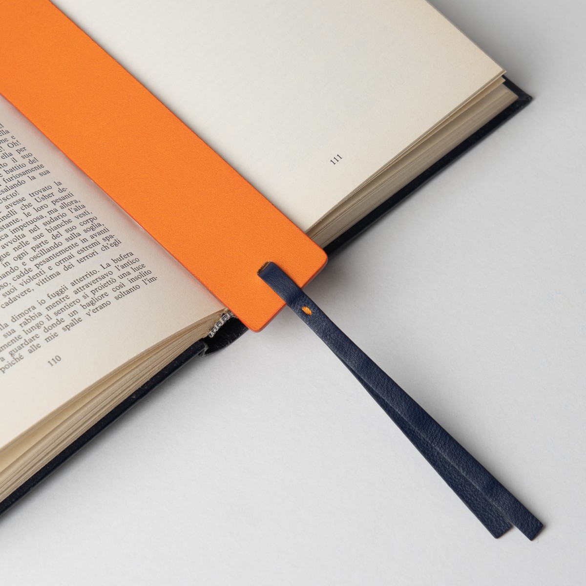 Segnalibro di colore arancione e blu con le seguenti misure 16,5 x 3,5 escluso il laccetto, tagli tinti con le migliori procedure per realizzare un bordo uniforme e bombato.