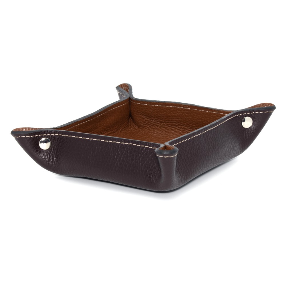 Molto bello ed elegante di colore marrone esternamente e cuoio internamente con cuciture chiare che danno un tocco di particolarità, con bordi tinti e chiuso con rivetti a pressione nickel free, con le seguenti misure 170 x 170mm la parte più larga con un altezza di 35mm, mentre il vassoio interno misura 130 x 130mm x 35mm, essendo in vera pelle da un tocco di classe in qualsiasi stanza oppure in ufficio sulla vostra scrivania, e si sposa sia con arredamenti classici, che moderni.